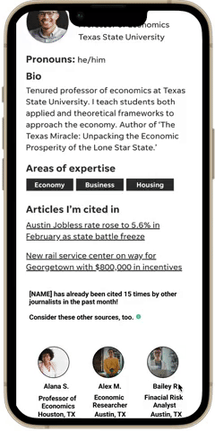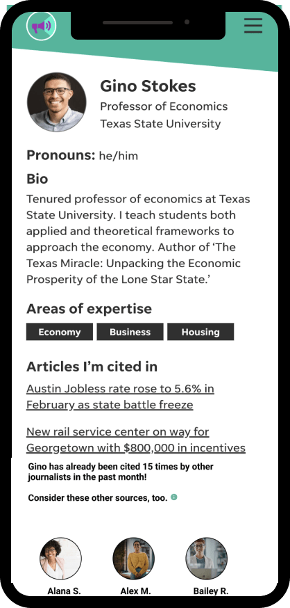In order to prevent the same sources from getting quoted over and over again and ensure all voices are being heard, we will put in a count for how many times they have been quoted, either by newsroom or the platform overall (decision on this TBD). This count will be internal for our team only and will trigger a notification on that user’s profile when journalists go to connect with them.